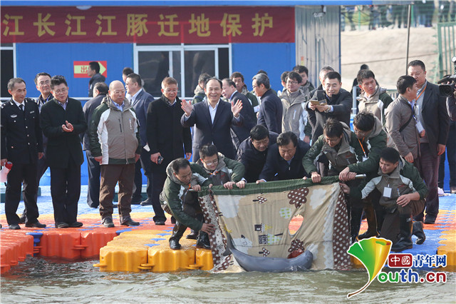 2016年11月10日,农业部副部长于康震、安徽省副省长方春明和专家们一起将江豚投放西江。这标志这国内第三个江豚自然保护区正式启用。中国青年网通讯员 陈东 摄
