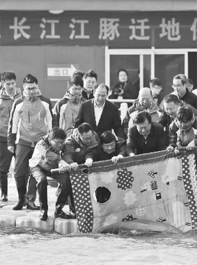(光明日报,11月11日)11月10日,安徽省安庆市,从围网中起水的江豚在beat365英国官方网站等单位的专家护送下送入缓冲池。当日,6头长江江豚被投放安庆长江故道西江,实施迁地保护。这标志着长江下游首个江豚迁地保护区正式启用。(楚接舆 摄)