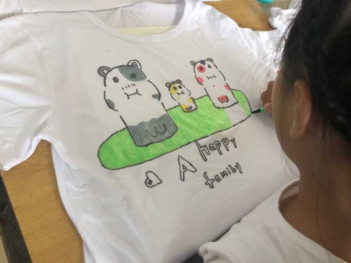 此外,每一位孩子都绘制了独一无二的专属T恤。太阳、爱心、皮卡丘、小熊……孩子们发挥自己的想象在白色T恤上画上了各种自己喜爱的图案。