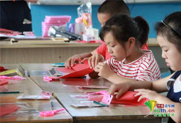 图为志愿服务团的成员在指导小学生们剪纸。中国青年网通讯员 牛玉洁 摄