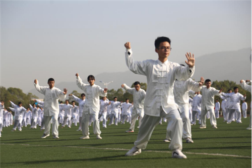 “预备!起势,左右野马分鬃……”伴随着悠远绵长的太极拳音乐,555名学子同步表演。起、承、转、和,一拳一式间,刚柔并举,瞬间将现场气氛引入高潮。“训练了两个月,我还是感觉很紧张,生怕在会场上出错。”广播电视学专业2018(1)班的张子毅在比赛结束后,仍然有些后怕。他是传媒学院太极拳队伍的一名选手,也是最先开始集训的学生教练,相较于别人,他的训练时间更长,对自己的要求也更严格。