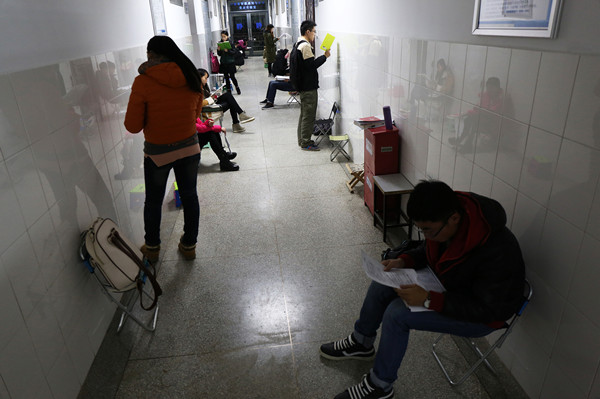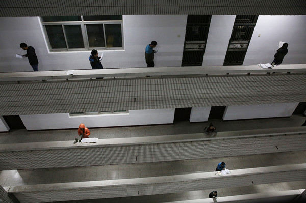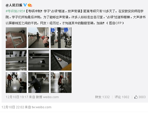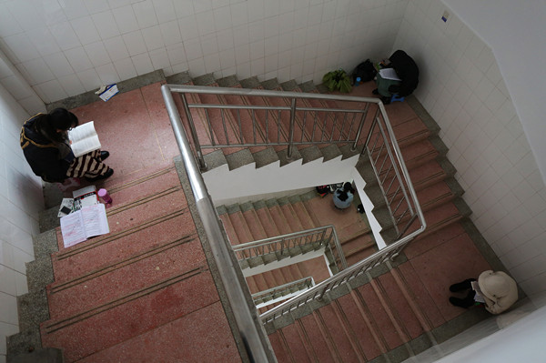 (12月10日人民日报微博)#考研倒计时#【考研冲刺!学子“占领”楼道,放声背诵】距离考研只有10多天了。在安徽安庆师范学院,学子们开始最后冲刺。为了能够出声背诵,许多人纷纷走出自习室,“占领”过道和楼梯,大声读书以屏蔽相互之间的干扰。网友:经历过,才知道其中的酸甜苦辣。加油!(摄影/陈东)