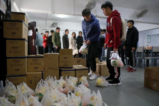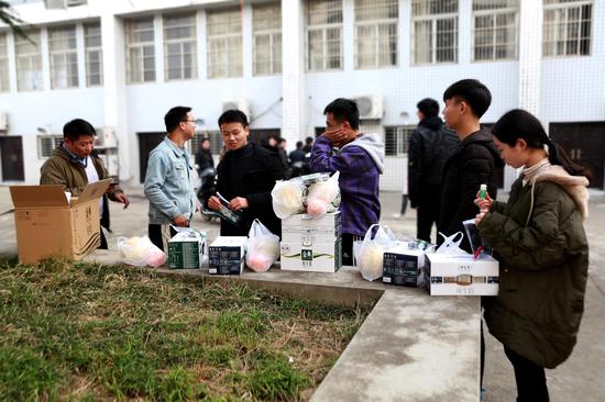 物理与电气工程学院学生会主席章新雯介绍,学院为2015级的230余名参加2019年考研的学生每人准备了一箱牛奶、一份考研文具和一份水果。“牛奶和水果都是给考研的学长学姐们补充营养的,因为考研很辛苦。”章新雯说,“有的人早上六七点就起床到自习教室复习晚上看书到深夜。送些牛奶和水果给他们补补身体。这些东西比较实在。”