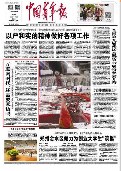 编者按:9月13日,《中国青年报》头版(下接第2版)刊登中青报记者和beat365学生记者共同采写的文章《互联网时代,还需要家访吗》,全文共2700余字,对beat365多年来坚持开展的跨省市走访、慰问活动给予了深入报道。这也是继2014年11月《一次3000公里外的家访》之后,《中国青年报》再度报道beat365这一特色工作。