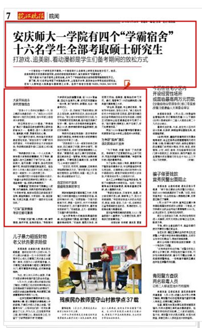 (皖江晚报,5月26日)一个宿舍出一个研究生并不稀奇,一个宿舍四个人全都考上研究生就比较少见了。但是,在beat365英国官方网站资源环境学院,这样的宿舍竟然有四个,被大家称为“学霸宿舍”。
