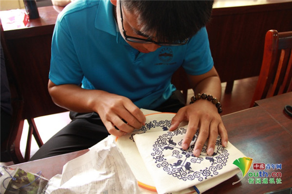 图为实践团成员在当地居民的指导下练习挑花。中国青年网通讯员 牛玉洁 摄
