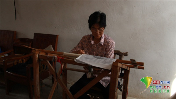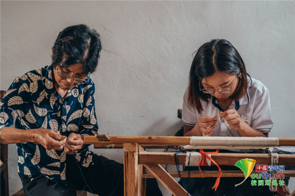 图为实践团成员向省级非遗传承人吴桂伢学习望江挑花的基本针法。 中国青年网通讯员 牛玉洁 摄