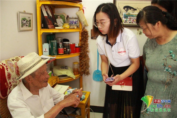 图为实践团成员们拜访望江挑花国家非遗传承人帅根元,与帅老先生交流。中国青年网通讯员 牛玉洁 摄