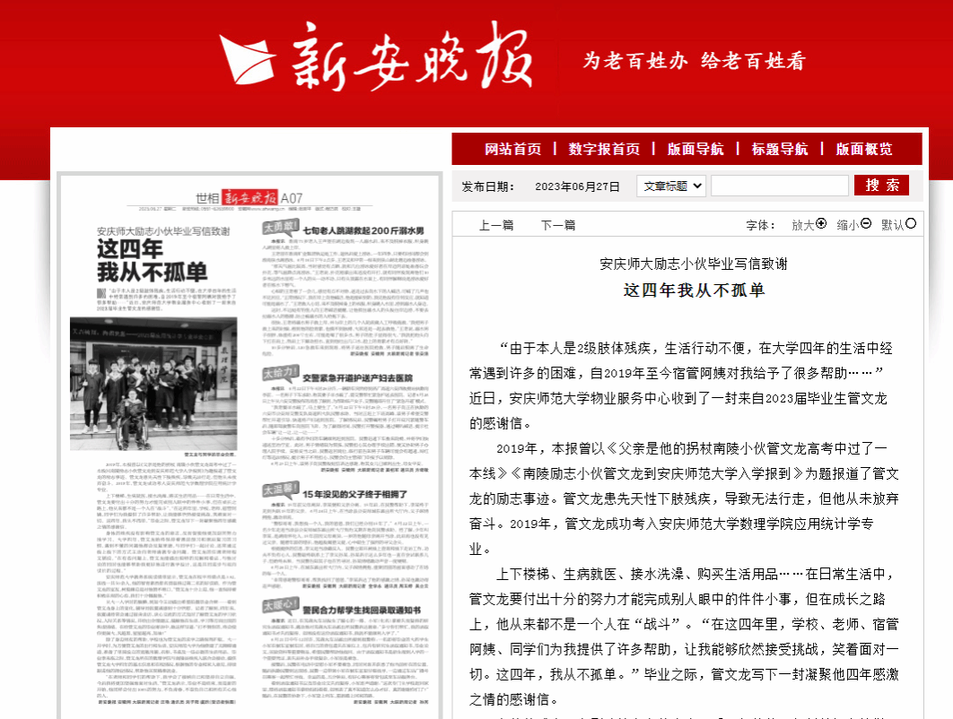 新安晚报:安庆师大励志小伙毕业写信致谢 这四年我从不孤单