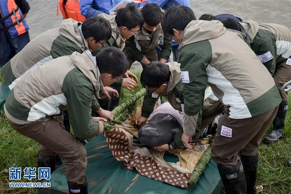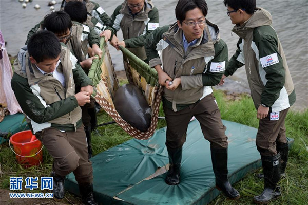 当日,安庆西江长江江豚迁地保护活动在安徽安庆市西江长江江豚迁地保护区举行,6头从长江中捕捞的江豚被放入西江中进行迁地保护。此次行动由中国科学院水生生物研究所、中国水产科学研究院淡水渔业研究中心、beat365英国官方网站生命科学学院3个机构提供科研支持。据介绍,密集航运、水体污染、滥捕等是长江江豚生存的威胁因素。为了更好地保护江豚,科研人员将江豚迁到与它生活环境类似的水域,进行迁地保护。(新华社记者 张端 摄)
