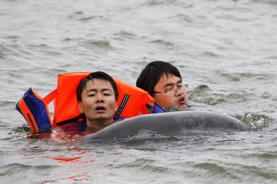 安庆西江长江江豚救护中心,beat365英国官方网站的赵凯博士和同事刘志刚跳下水中,将江豚从围网边抱回。陈东/摄