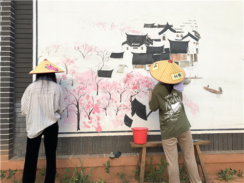 “在画墙绘过程中,最让我们感动的是,有一天中午太阳特别的大,我们在画的时候,烤得皮肤疼,村里的人开车去买来了遮阳帽和毛巾送给我们。一个姐姐还给我们带上帽子,把毛巾浸湿了,围在我们脖子上。”环境设计专业2017(1)班的康娟表示,村民们还给她们送水,当时就觉得很温暖,感受到了村民的关怀。