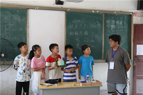 “同学们,你们觉得平时扔掉的纸盒还有什么作用呢?没错,今天我们要用纸盒制作一个相框……”创意手工课上,23名同学被分为5组进行手工制作活动,地理科学专业2018(1)班的夏雪作为支教老师将彩纸、双面胶、剪刀等工具分发给每一小组,并不时叮嘱学生在使用刀具时所需注意的事项。